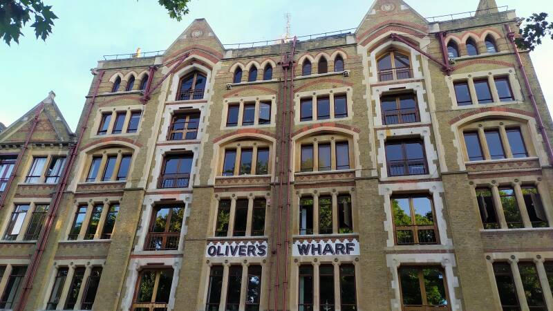 You will see a few converted huge Victorian warehouses. Look up: OLIVER’S WHARF was the place where CHER, the American singer and actress bought an apartment in the 1990s, when the London DOCKLANDS where becoming a sought after place. By the way, the word WHARF is everywhere. And the name of each one. A WHARF is the place, the building, where goods are loaded and unloaded, always on the banks of a watercourse or the sea ... which is why some linguists claim that it is an acronym (Ware Housing At River Front).